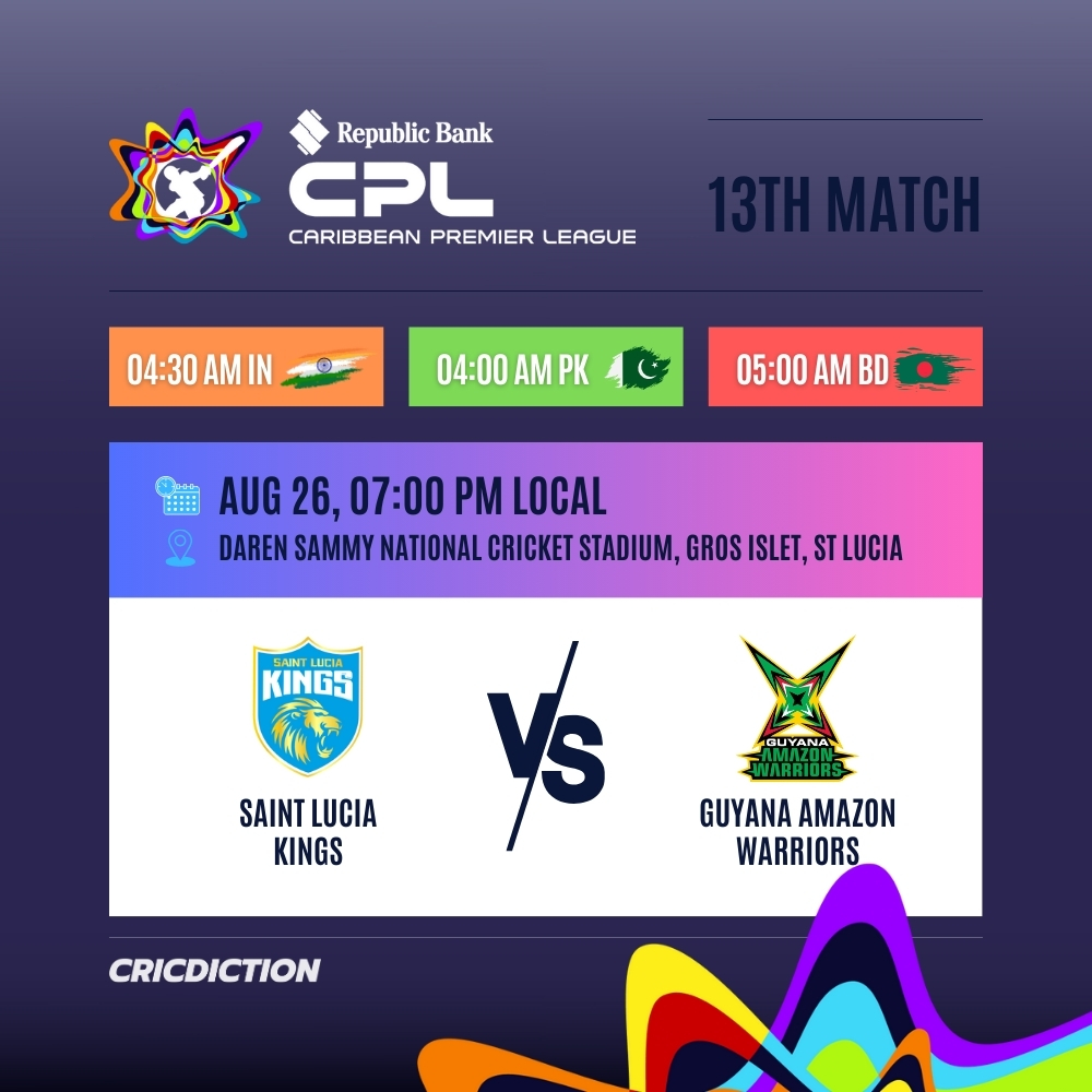 Saint Lucia Kings (SLK) is gearing up to take on Guyana Amazon Warriors (GAW) in their 13th match of The Caribbean Premier League 2025 at the Daren Sammy National Cricket Stadium on Tuesday, August 26.